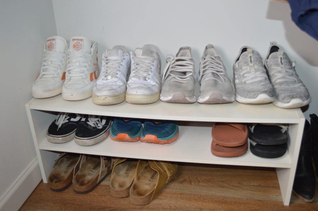 I already had this white wooden shoe rack to keep my tennis shoes and slides easily accessible. It’s nothing fancy but it does exactly what I need it to. I need to be able to easily get my shoes on and off and put them away hassle free. This checks all those boxes.