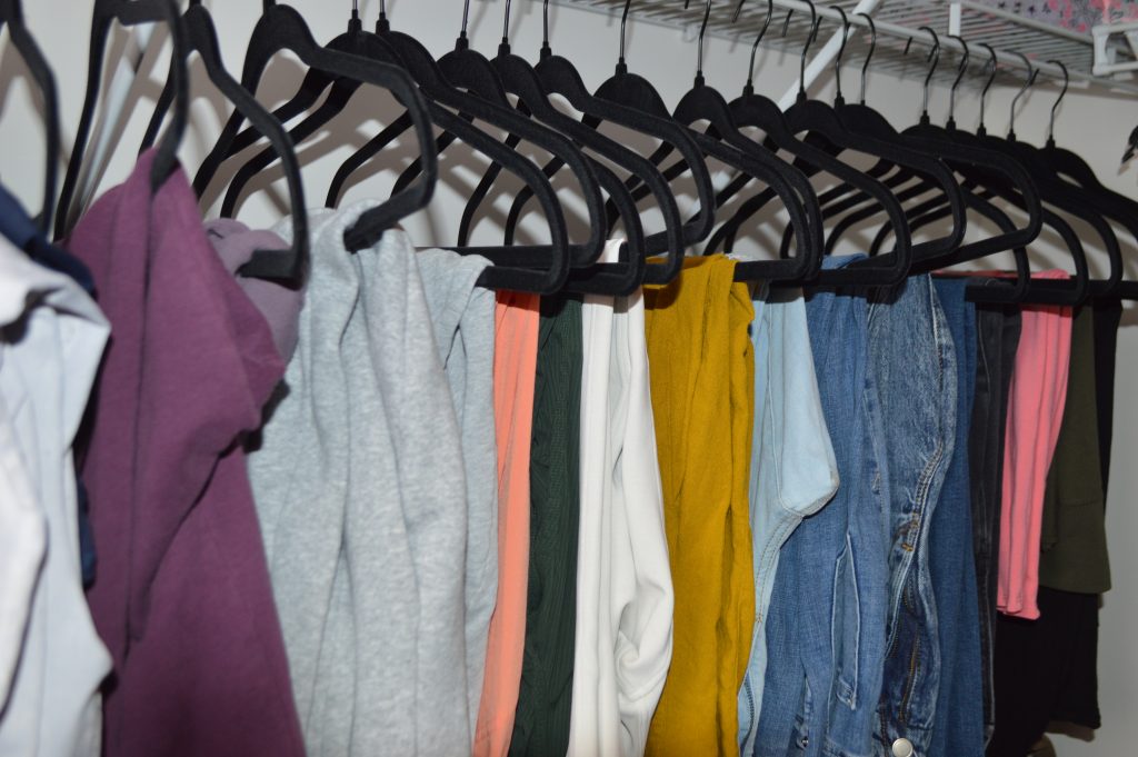 Going into this remind yourself that it’s going to look a lot worse before it gets better. That’s just part of the process. Start at the very top of your closet and remove every single thing as you make your way all the way down to the floor. As you’re removing things, begin placing them into piles. There’s no perfect way to do this but figure out what makes sense for you. I chose to place them in piles by type of clothing. You can get as specific as you want. I had all my pants divided into jeans, sweatpants, yoga pants and dress pants. Dresses were divided into summer casual, dressy and skirts. As I pulled each item out I had a designated donation pile so I knew exactly what was being kept and what was going.